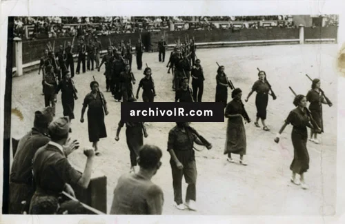 Mujeres desfilando en una corrida a beneficio de las milicias. Plaza de toros de Madrid, septiembre de 1936.