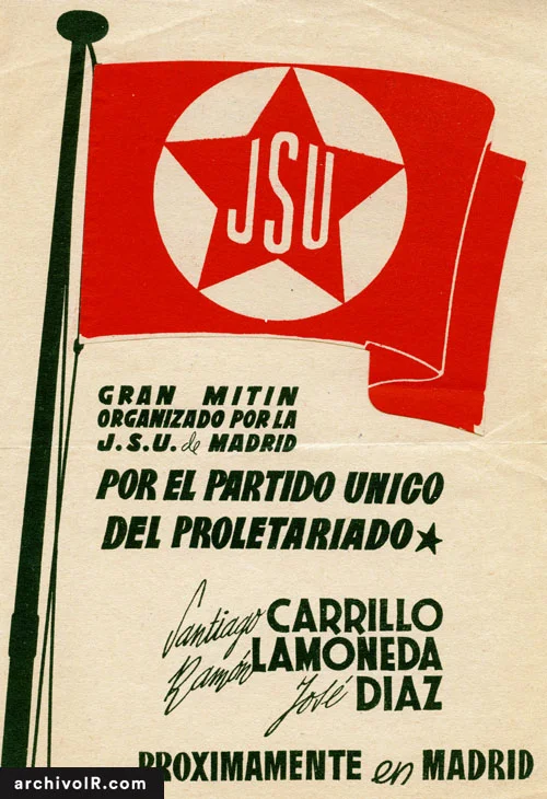 Gran Mitin organizado por la J.S.U. de Madrid. Por el partido único del proletariado. Santiago carrillo, Ramón Lamoneda. José Díaz. Proximamente en Madrid.
